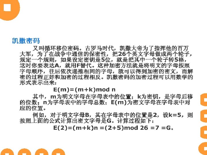 复习:密码分析的分类 • 根据分析者具备的条件,通常分为 4类: ① 唯密文攻击(Ciphertext-only attack) • 分析者有一个或更多的用同一密钥加密的密文。 ② 已知明文攻击(Known-plaintext attack) • 除了待破解的密文,分析者还有一些明文和用同一密钥加密的对应密文。 ③ 选择明文攻击(Chosen-plaintext attack) • 分析者可以得到所需要的任何明文对应的密文,这些密文和待破解的密文是用 同一密钥加密的。密码分析者可以选择一些明文,并得到相应的密文,而且可以 选择被加密的明文,并试图推导出加密密钥或算法。 ® ④ 选择密文攻击(Chosen-ciphertext attack) ® • 分析这可以得到所需要的任何密文对应的明文,类似地,这些密文和待破解的 密文是同一密钥加密的,获得密钥是分析者的主要目的。密码分析者可以选择不 同的密文,并能得到相应的明文,并试图推导出加密密钥。 ® ⑤ 选择密钥攻击(Chosen-key attack) ® ® ® ®