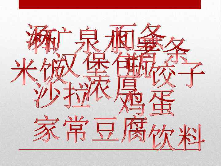 汉堡包 hànbǎobāo 服装 fúzhuāng 薯条 shǔtiáo 比萨饼 bǐsàbǐng