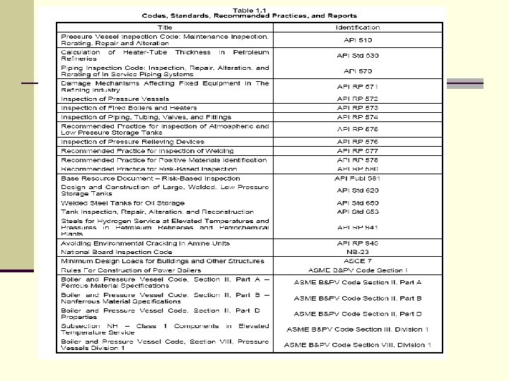 常用 Api code n n n n APIAPI 510 Pressure Vessel Inspection Code: In-Service Inspection, Rating, Repair, and Alteration Ninth Edition) APIAPI 570 Piping Inspection Code Inspection, Repair, Alteration, and Rerating of In. Service Piping Systems Second Edition APIRP 571 Damage Mechanisms Affecting Fixed Equipment in the Refining Industry First Edition APIRP 572 Inspection of Pressure Vessels (Towers, Drums, Reactors, Heat Exchangers, and Condensers) Second Edition APIRP 573 Inspection of Fired Boilers and Heaters Second Edition APIRP 574 Inspection Practices for Piping System Components Second Edition ( APIRP 575 Guidelines and Methods for Inspection of Existing Atmospheric and Low. Pressure Storage Tanks Second Edition APIRP 576 Inspection of Pressure-Relieving Devices Second Edition APIRP 577 Welding Inspection and Metallurgy First Edition APIRP 578 Material Verification Program for New and Existing Alloy Piping Systems First Edition APIRP 580 Risk-Based Inspection First Edition APIRP 941 Steels for Hydrogen Service at Elevated Temperatures and Pressures in Petroleum Refineries and Petrochemical Plants Seventh Edition APIRP 945 Avoiding Environmental Cracking in Amine Units Third Edition 598 Valve Inspection and Testing Eighth Edition APISTD 620 Design and Construction of Large, Welded, Low-pressure Storage Tanks Eleventh Edition;