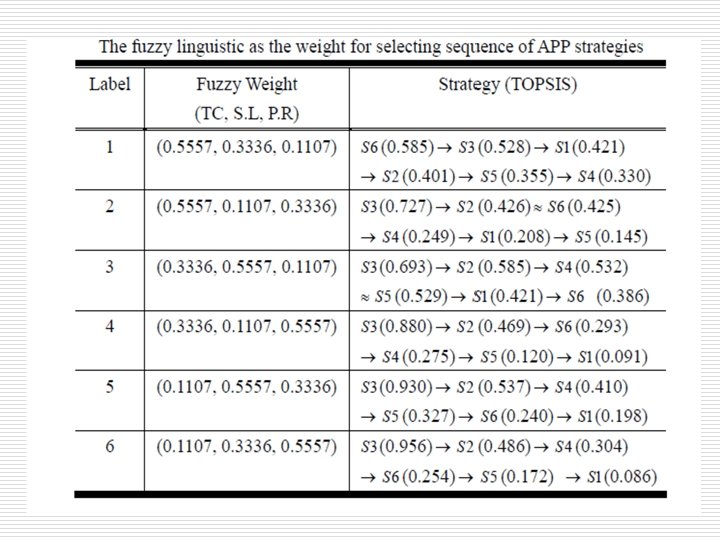 Fuzzy linguistic for the APP’s six strategies-3 o In this paper, the authors use the 1000 simulation runs for each APP strategies and to obtain the average TC, SL, and PR; then the fuzzy weights are assigned to the three objectives, and TOPSIS is calculated for the selecting sequence of APP strategies for the practical application.