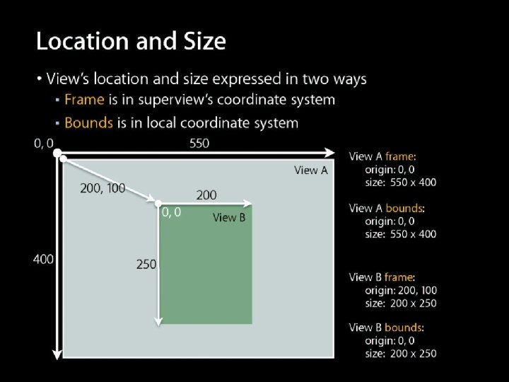 set. Frame 使用絕對座標的方式來表達, 假設你要在View A 裡定位View B, 使用set. Frame是比較方便 若View B為View A的subview, (0, 0)位置是View A的左上角座標, 則View B可為 CGRect *rect=CGRect. Make(200, 100, 200, 100); [view. B set. Frame: rect];