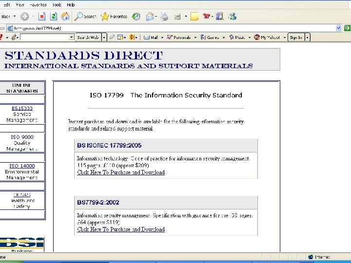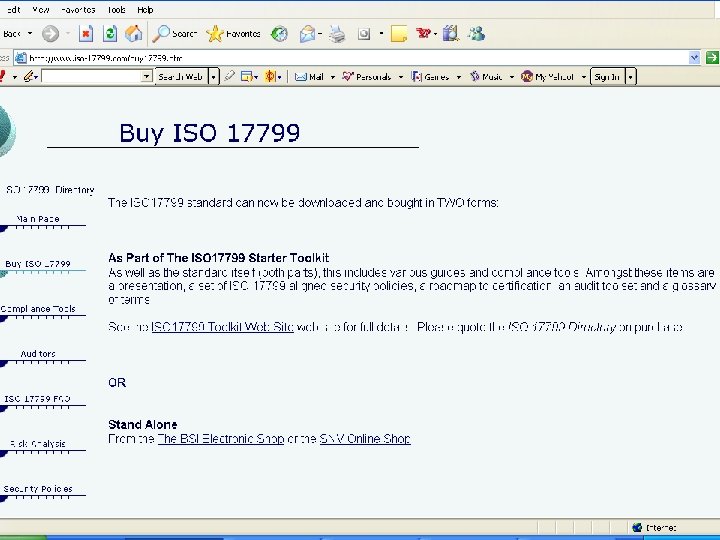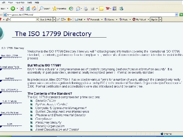 Information Security Governance Framework n Initially, there was an emphasis on ISO/IEC 17799 – as a framework on Information Security Management – but this approach is simply a set of guidelines on ‘minimum requirements’ and is not process driven. n ISACA/ITGI work on COBIT – Control Objectives on IT & Related Technologies and Governance fills this gap – because it measures the effectiveness of IT processes. n Therefore, for complete IS Governance, organisations need to adopt both ISO/IEC 17799 & COBIT.