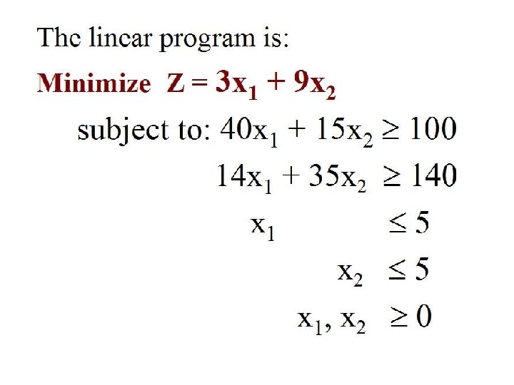 6 8 40 X 1 +15 X 2 >=100 14 X 1 + 35 X 2>=140 X 1 <=5 X 2 <=5 X 1, X 2 >=0 2 4 X 2 Optimal Solution X 1 = 5 X 2 = 2 3 X 1 + 9 X 2 = ? 0 1 2 3 4 X 1 5 6