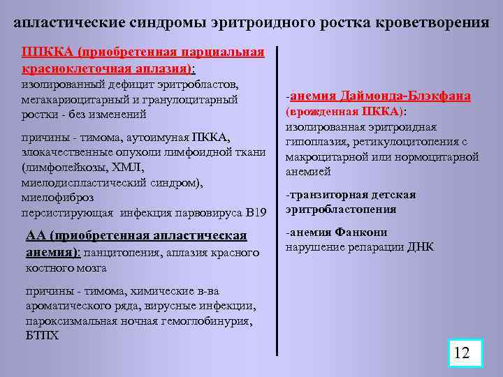апластические синдромы эритроидного ростка кроветворения ППККА (приобретенная парциальная красноклеточная аплазия): изолированный дефицит эритробластов, мегакариоцитарный и гранулоцитарный ростки - без изменений причины - тимома, аутоимуная ПККА, злокачественные опухоли лимфоидной ткани (лимфолейкозы, ХМЛ, миелодиспластический синдром), миелофиброз персистирующая инфекция парвовируса В 19 АА (приобретенная апластическая анемия): панцитопения, аплазия красного -анемия Даймонда-Блэкфана (врожденная ПККА): изолированная эритроидная гипоплазия, ретикулоцитопения с макроцитарной или нормоцитарной анемией -транзиторная детская эритробластопения -анемия Фанкони нарушение репарации ДНК костного мозга причины - тимома, химические в-ва ароматического ряда, вирусные инфекции, пароксизмальная ночная гемоглобинурия, БТПХ 12