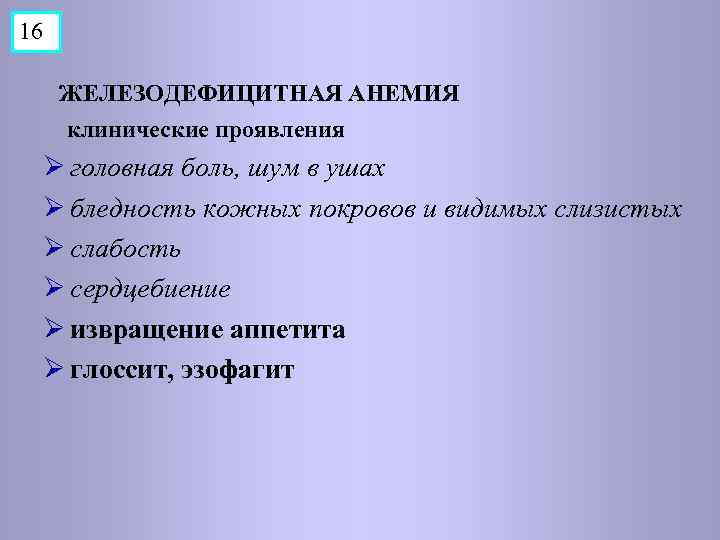 16 ЖЕЛЕЗОДЕФИЦИТНАЯ АНЕМИЯ клинические проявления Ø головная боль, шум в ушах Ø бледность кожных покровов и видимых слизистых Ø слабость Ø сердцебиение Ø извращение аппетита Ø глоссит, эзофагит
