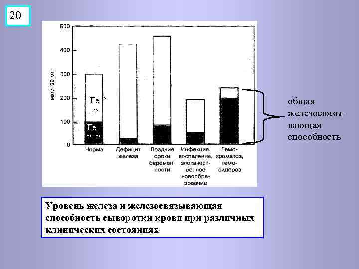 20 Fe ” -” Fe ”+” Уровень железа и железосвязывающая способность сыворотки крови при различных клинических состояниях общая железосвязывающая способность