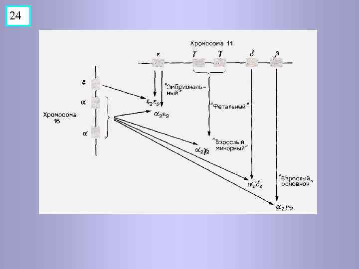 25 талассемия (гипохромная микроцитарная врожденная гемолитическая анемия) 0 -талассемии (нонсенс мутации, гомозигота анемия Кули) одна функционирующая аллель выраженные признаки, Нгемоглобинопатия ( -тетрамер) умеренная анемия и гемолиз +-талассемии (мутации промоторной области, нарушения сплайсинга) накопление -тетрамеров, увеличенный синтез и -глобинов водянка плода - гомозиготная -талассемия (гемоглобин Барт с высоким сродством к кислороду) тканевая гипоксия, отеки, смерть в неонатальном периоде