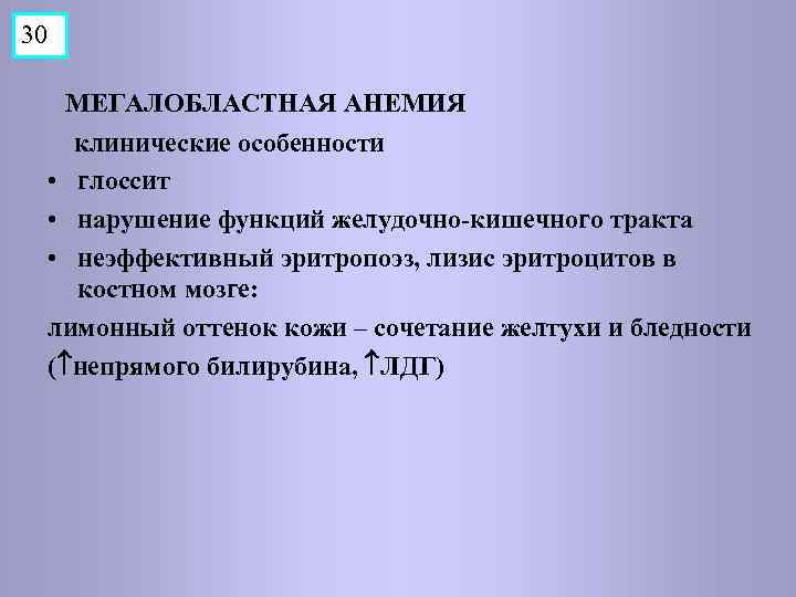 30 МЕГАЛОБЛАСТНАЯ АНЕМИЯ клинические особенности • глоссит • нарушение функций желудочно-кишечного тракта • неэффективный эритропоэз, лизис эритроцитов в костном мозге: лимонный оттенок кожи – сочетание желтухи и бледности ( непрямого билирубина, ЛДГ)
