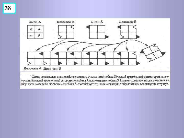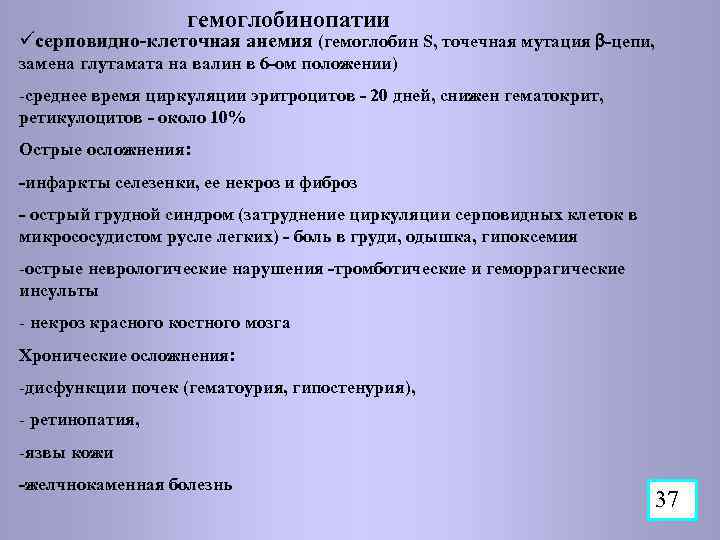 гемоглобинопатии üсерповидно-клеточная анемия (гемоглобин S, точечная мутация -цепи, замена глутамата на валин в 6 -ом положении) -среднее время циркуляции эритроцитов - 20 дней, снижен гематокрит, ретикулоцитов - около 10% Острые осложнения: -инфаркты селезенки, ее некроз и фиброз - острый грудной синдром (затруднение циркуляции серповидных клеток в микрососудистом русле легких) - боль в груди, одышка, гипоксемия -острые неврологические нарушения -тромботические и геморрагические инсульты - некроз красного костного мозга Хронические осложнения: -дисфункции почек (гематоурия, гипостенурия), - ретинопатия, -язвы кожи -желчнокаменная болезнь 37