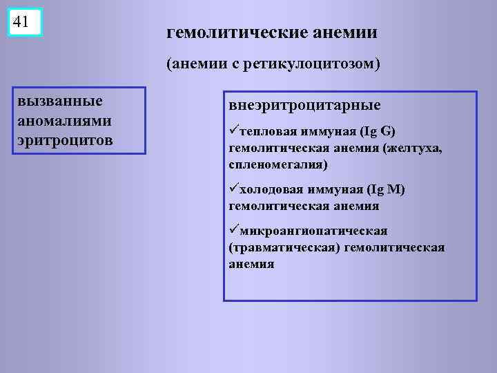 41 гемолитические анемии (анемии с ретикулоцитозом) вызванные аномалиями эритроцитов внеэритроцитарные üтепловая иммуная (Ig G) гемолитическая анемия (желтуха, спленомегалия) üхолодовая иммуная (Ig M) гемолитическая анемия üмикроангиопатическая (травматическая) гемолитическая анемия