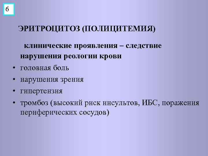 5 эритроцитозы АБСОЛЮТНЫЕ: повышение массы циркулирующих эритроцитов (эритроцитарная масса) мужчины - более 36 мл /кг женщины - более 32 мл /кг ОТНОСИТЕЛЬНЫЕ - обусловлены гемоконцентрацией мужчины женщины гемоглобин 177 г/л 157 г/л эритроциты 5, 5 млн/мкл гематокрит 0, 52 0, 47