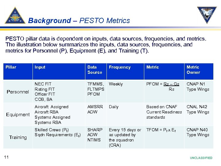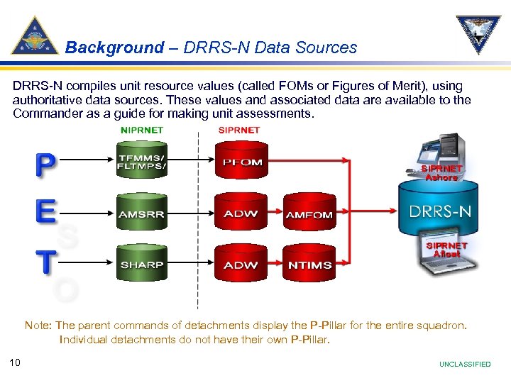 Background – DRRS-N Data Sources DRRS-N compiles unit resource values (called FOMs or Figures of Merit), using authoritative data sources. These values and associated data are available to the Commander as a guide for making unit assessments. Note: The parent commands of detachments display the P-Pillar for the entire squadron. Individual detachments do not have their own P-Pillar. 10 UNCLASSIFIED