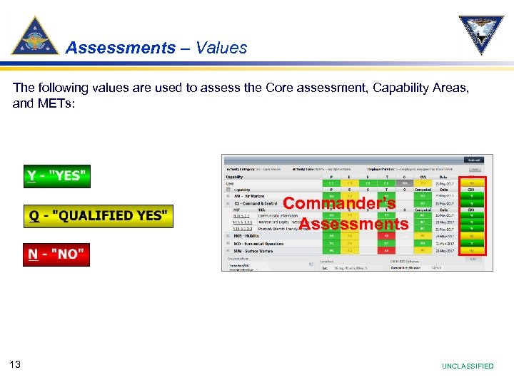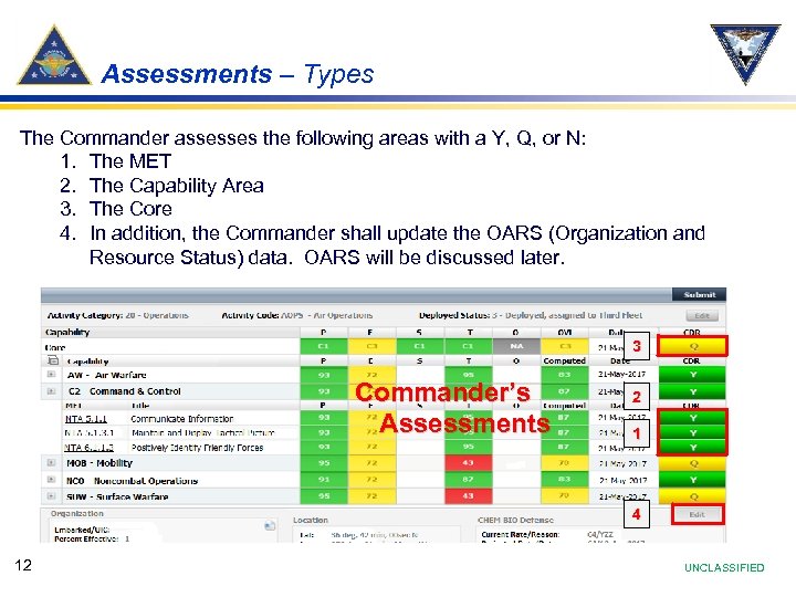 Assessments – Types The Commander assesses the following areas with a Y, Q, or N: 1. The MET 2. The Capability Area 3. The Core 4. In addition, the Commander shall update the OARS (Organization and Resource Status) data. OARS will be discussed later. 3 Commander’s Assessments 2 1 4 12 UNCLASSIFIED