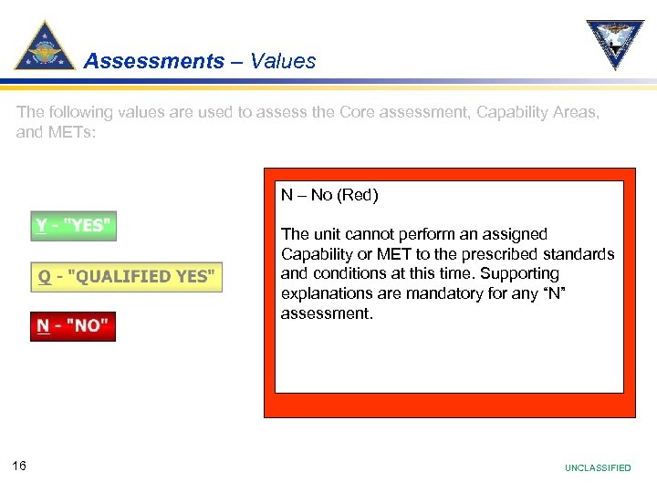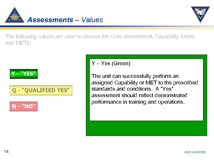 Assessments – Values The following values are used to assess the Core assessment, Capability Areas, and METs: Y – Yes (Green) The unit can successfully perform an assigned Capability or MET to the prescribed standards and conditions. A “Yes” assessment should reflect demonstrated performance in training and operations. 14 UNCLASSIFIED
