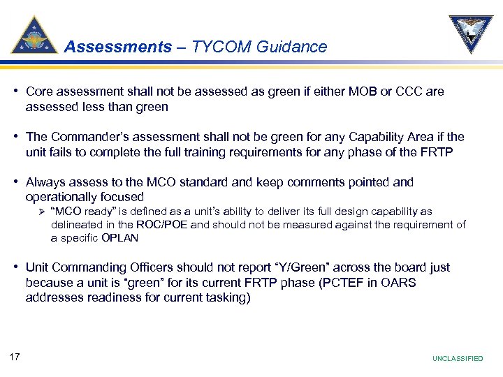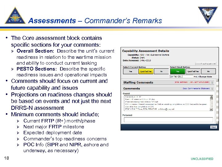 Assessments – TYCOM Guidance • Core assessment shall not be assessed as green if either MOB or CCC are assessed less than green • The Commander’s assessment shall not be green for any Capability Area if the unit fails to complete the full training requirements for any phase of the FRTP • Always assess to the MCO standard and keep comments pointed and operationally focused Ø “MCO ready” is defined as a unit’s ability to deliver its full design capability as delineated in the ROC/POE and should not be measured against the requirement of a specific OPLAN • Unit Commanding Officers should not report “Y/Green” across the board just because a unit is “green” for its current FRTP phase (PCTEF in OARS addresses readiness for current tasking) 17 UNCLASSIFIED
