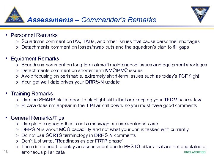 Assessments – Commander’s Remarks • The Core assessment block contains specific sections for your comments: Ø Ø Overall Section: Describe the unit’s current readiness in relation to the wartime mission and ability to conduct current tasking PESTO Sections: Describe the specific readiness issues and operational impacts • Comments should focus on current and • • future capability and issues Projections on readiness changes should be based on events and not just the next DRRS-N assessment Minimum comments should include; Ø Ø Ø 18 Current FRTP (R+) month/phase Next major FRTP milestone Expected deployment date Commander’s top readiness concerns POC Info (SIPR and NIPR, ashore and underway, as necessary) UNCLASSIFIED