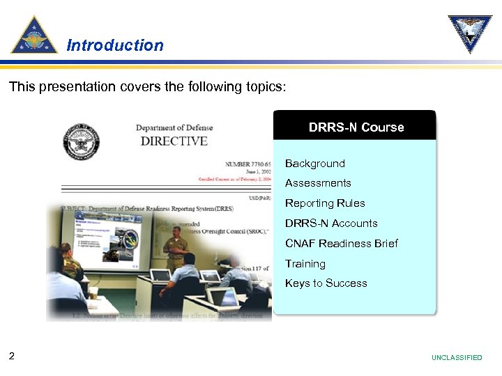 Introduction This presentation covers the following topics: DRRS-N Course Background Assessments Reporting Rules DRRS-N Accounts CNAF Readiness Brief Training Keys to Success 2 UNCLASSIFIED