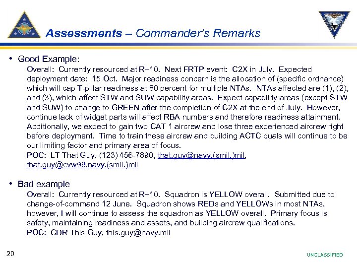 Assessments – Commander’s Remarks • Good Example: Overall: Currently resourced at R+10. Next FRTP event: C 2 X in July. Expected deployment date: 15 Oct. Major readiness concern is the allocation of (specific ordnance) which will cap T-pillar readiness at 80 percent for multiple NTAs affected are (1), (2), and (3), which affect STW and SUW capability areas. Expect capability areas (except STW and SUW) to change to GREEN after the completion of C 2 X at the end of July. However, continue lack of widget parts will affect RBA numbers and therefore readiness attainment. Additionally, we expect to gain two CAT 1 aircrew and lose three experienced aircrew right before deployment. Time to train these aircrew and building ACTC quals will continue to be our limiting factor and primary area of focus. POC: LT That Guy, (123) 456 -7890, that. guy@navy. (smil. )mil, that. guy@cvw 99. navy. (smil. )mil • Bad example Overall: Currently resourced at R+10. Squadron is YELLOW overall. Submitted due to change-of-command 12 June. Squadron shows REDs and YELLOWs in most NTAs, however, I will continue to assess the squadron as YELLOW overall. Primary focus is safety, maintaining readiness and assets, and building aircrew qualifications. POC: CDR This Guy, this. guy@navy. mil 20 UNCLASSIFIED