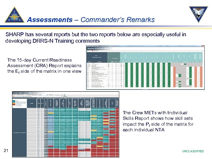 Assessments – Commander’s Remarks SHARP has several reports but the two reports below are especially useful in developing DRRS-N Training comments The 15 -day Current Readiness Assessment (CRA) Report explains the Ef side of the matrix in one view The Crew METs with Individual Skills Report shows how skill sets impact the Pf side of the matrix for each individual NTA 21 UNCLASSIFIED