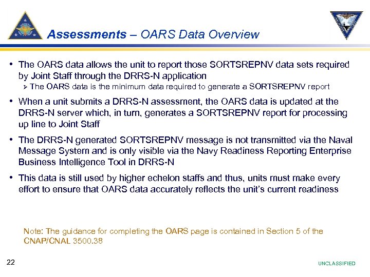Assessments – OARS Data Overview • The OARS data allows the unit to report those SORTSREPNV data sets required by Joint Staff through the DRRS-N application Ø The OARS data is the minimum data required to generate a SORTSREPNV report • When a unit submits a DRRS-N assessment, the OARS data is updated at the DRRS-N server which, in turn, generates a SORTSREPNV report for processing up line to Joint Staff • The DRRS-N generated SORTSREPNV message is not transmitted via the Naval Message System and is only visible via the Navy Readiness Reporting Enterprise Business Intelligence Tool in DRRS-N • This data is still used by higher echelon staffs and thus, units must make every effort to ensure that OARS data accurately reflects the unit’s current readiness Note: The guidance for completing the OARS page is contained in Section 5 of the CNAP/CNAL 3500. 38 22 UNCLASSIFIED