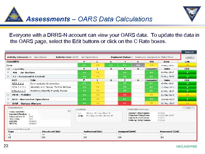 Assessments – OARS Data Calculations Everyone with a DRRS-N account can view your OARS data. To update the data in the OARS page, select the Edit buttons or click on the C Rate boxes. 23 UNCLASSIFIED