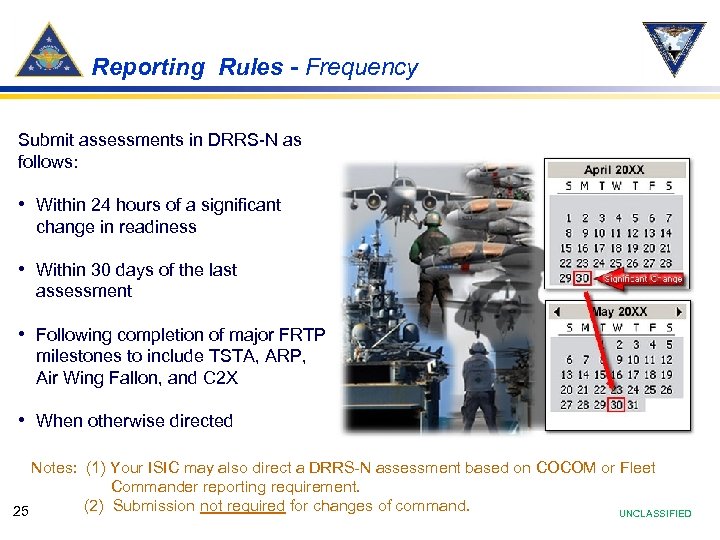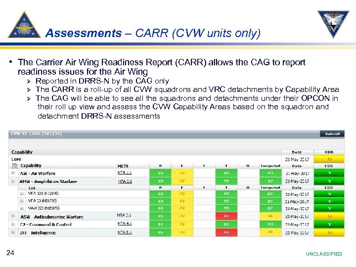 Assessments – CARR (CVW units only) • The Carrier Air Wing Readiness Report (CARR) allows the CAG to report readiness issues for the Air Wing Ø Ø Ø 24 Reported in DRRS-N by the CAG only The CARR is a roll-up of all CVW squadrons and VRC detachments by Capability Area The CAG will be able to see all the squadrons and detachments under their OPCON in their roll up view and assess the CVW Capability Areas based on the squadron and detachment DRRS-N assessments UNCLASSIFIED