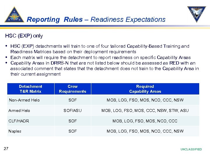 Reporting Rules – Readiness Expectations • The Fleet Response Training Plan (FRTP) standards are designed to incrementally prepare a • • • unit for its full wartime readiness During an FRTP cycle, the expectations of readiness increase progressively from “No”(Red) in the maintenance phase to “Yes”(Green) at the beginning of a unit’s employability window Units should strive to maintain a “Yes”(Green) throughout their employability window unless their mission forces a degrade in certain Capability Areas (single mission focus, non-wartime tasking) Not all units follow this type of FRTP model (HM, VQ(T), VPU, and FDNF) Maintenance Basic Intermediate Employability T&R Funding DRRS-N Note: Currently, MOB is the only Capability Area that is intended to be green prior to the employability phase. 26 UNCLASSIFIED