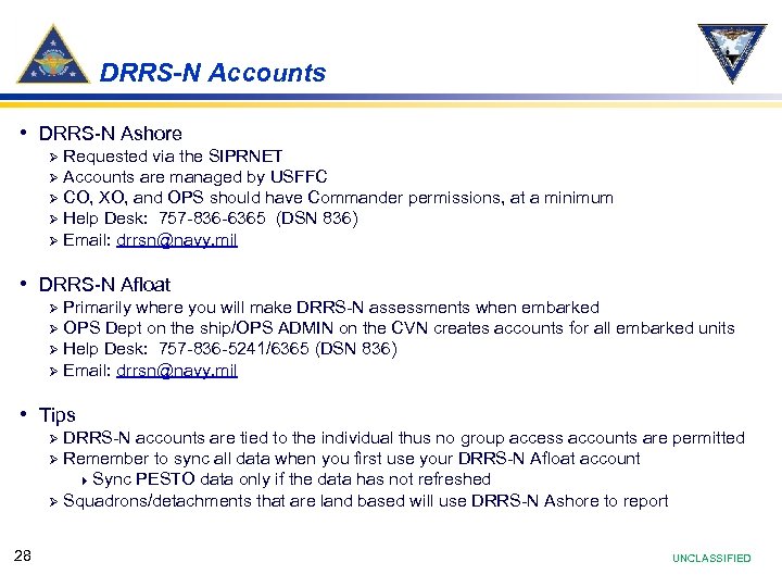 DRRS-N Accounts • DRRS-N Ashore Requested via the SIPRNET Ø Accounts are managed by USFFC Ø CO, XO, and OPS should have Commander permissions, at a minimum Ø Help Desk: 757 -836 -6365 (DSN 836) Ø Email: drrsn@navy. mil Ø • DRRS-N Afloat Primarily where you will make DRRS-N assessments when embarked Ø OPS Dept on the ship/OPS ADMIN on the CVN creates accounts for all embarked units Ø Help Desk: 757 -836 -5241/6365 (DSN 836) Ø Email: drrsn@navy. mil Ø • Tips DRRS-N accounts are tied to the individual thus no group access accounts are permitted Ø Remember to sync all data when you first use your DRRS-N Afloat account 4 Sync PESTO data only if the data has not refreshed Ø Squadrons/detachments that are land based will use DRRS-N Ashore to report Ø 28 UNCLASSIFIED
