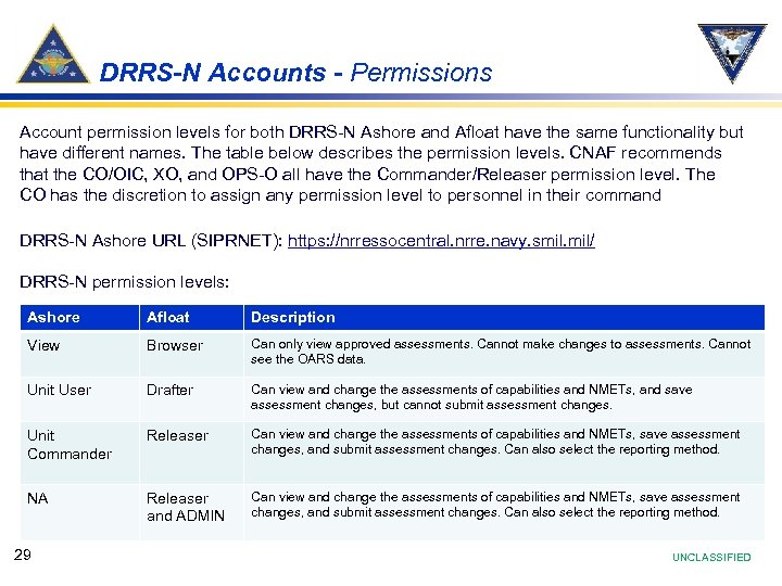 DRRS-N Accounts - Permissions Account permission levels for both DRRS-N Ashore and Afloat have the same functionality but have different names. The table below describes the permission levels. CNAF recommends that the CO/OIC, XO, and OPS-O all have the Commander/Releaser permission level. The CO has the discretion to assign any permission level to personnel in their command DRRS-N Ashore URL (SIPRNET): https: //nrressocentral. nrre. navy. smil. mil/ DRRS-N permission levels: Ashore Afloat Description View Browser Can only view approved assessments. Cannot make changes to assessments. Cannot see the OARS data. Unit User Drafter Can view and change the assessments of capabilities and NMETs, and save assessment changes, but cannot submit assessment changes. Unit Commander Releaser Can view and change the assessments of capabilities and NMETs, save assessment changes, and submit assessment changes. Can also select the reporting method. NA Releaser and ADMIN Can view and change the assessments of capabilities and NMETs, save assessment changes, and submit assessment changes. Can also select the reporting method. 29 UNCLASSIFIED