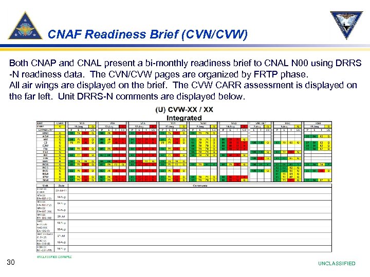CNAF Readiness Brief (CVN/CVW) Both CNAP and CNAL present a bi-monthly readiness brief to CNAL N 00 using DRRS -N readiness data. The CVN/CVW pages are organized by FRTP phase. All air wings are displayed on the brief. The CVW CARR assessment is displayed on the far left. Unit DRRS-N comments are displayed below. 30 UNCLASSIFIED