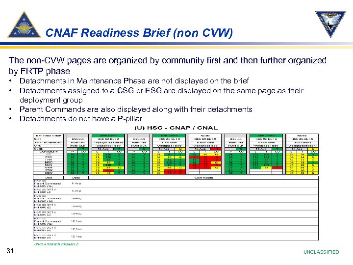 CNAF Readiness Brief (non CVW) The non-CVW pages are organized by community first and then further organized by FRTP phase • • 31 Detachments in Maintenance Phase are not displayed on the brief Detachments assigned to a CSG or ESG are displayed on the same page as their deployment group Parent Commands are also displayed along with their detachments Detachments do not have a P-pillar UNCLASSIFIED