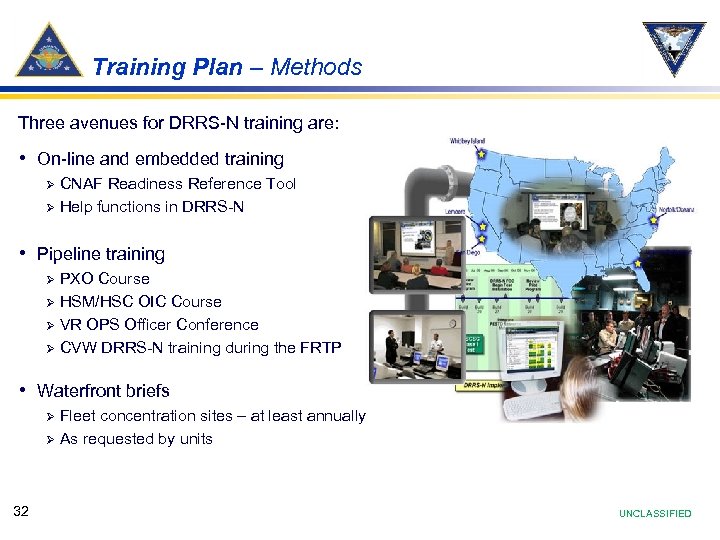 Training Plan – Methods Three avenues for DRRS-N training are: • On-line and embedded training CNAF Readiness Reference Tool Ø Help functions in DRRS-N Ø • Pipeline training PXO Course Ø HSM/HSC OIC Course Ø VR OPS Officer Conference Ø CVW DRRS-N training during the FRTP Ø • Waterfront briefs Fleet concentration sites – at least annually Ø As requested by units Ø 32 UNCLASSIFIED