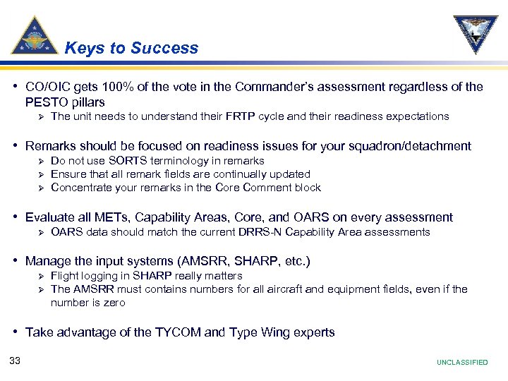 Keys to Success • CO/OIC gets 100% of the vote in the Commander’s assessment regardless of the PESTO pillars Ø The unit needs to understand their FRTP cycle and their readiness expectations • Remarks should be focused on readiness issues for your squadron/detachment Ø Ø Ø Do not use SORTS terminology in remarks Ensure that all remark fields are continually updated Concentrate your remarks in the Core Comment block • Evaluate all METs, Capability Areas, Core, and OARS on every assessment Ø OARS data should match the current DRRS-N Capability Area assessments • Manage the input systems (AMSRR, SHARP, etc. ) Ø Ø Flight logging in SHARP really matters The AMSRR must contains numbers for all aircraft and equipment fields, even if the number is zero • Take advantage of the TYCOM and Type Wing experts 33 UNCLASSIFIED