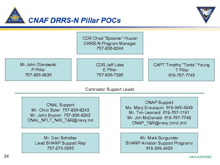 CNAF DRRS-N Pillar POCs CDR Chad “Spooner” Hixson DRRS-N Program Manager 757 -836 -8244 Mr John Olanowski P Pillar 757 -836 -9936 CDR Jeff Lake E Pillar 757 -836 -7396 CAPT Timothy “Tonto” Young T Pillar 619 -767 -7745 Contractor Support Leads CNAL Support Mr. Chris Soler 757 -836 -8243 Mr. John Bryson 757 -836 -8242 CNAL_NFLT_N 40_T&R@navy. mil Mr. Dan Scholtes Lead SHARP Support Rep 757 -270 -0955 34 CNAP Support Ms. Mary Erausquin 619 -545 -4349 Mr. Tim Leonard 619 -767 -1191 Mr. Jim Mc. Donald 619 -767 -7748 CNAP_T&R@navy. (smil. )mil Mr. Mark Burgunder SHARP Aviation Support Programs 619 -249 -4426 UNCLASSIFIED