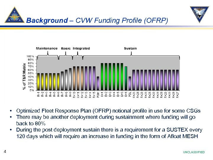 Background – How We Manage Readiness GFM OPLAN/CONPLAN Joint Staff OPNAV N 43 Overall Sponsor for Navy Readiness $FHP, $Ranges, $Ordnance OPNAV/Fleet FFC/CPF MAP Allocates resources across TYCOMS CNAP/CNAL FRTP Training Events FRTP Profile 3 T&R Matrices 3510 Entitlements Sets R+ months, allocates FHP, TAD Manages Aircraft maintenance TYCOM reso urce s requirem ents Warfighters CSG/CVW/SQDN/DET UNCLASSIFIED 3