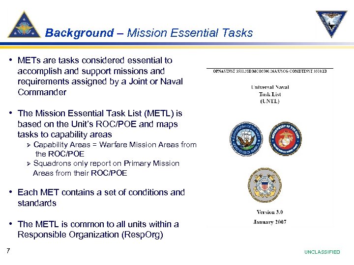 Background – Mission Essential Tasks • METs are tasks considered essential to accomplish and support missions and requirements assigned by a Joint or Naval Commander • The Mission Essential Task List (METL) is based on the Unit’s ROC/POE and maps tasks to capability areas Capability Areas = Warfare Mission Areas from the ROC/POE Ø Squadrons only report on Primary Mission Areas from their ROC/POE Ø • Each MET contains a set of conditions and standards • The METL is common to all units within a Responsible Organization (Resp. Org) 7 UNCLASSIFIED