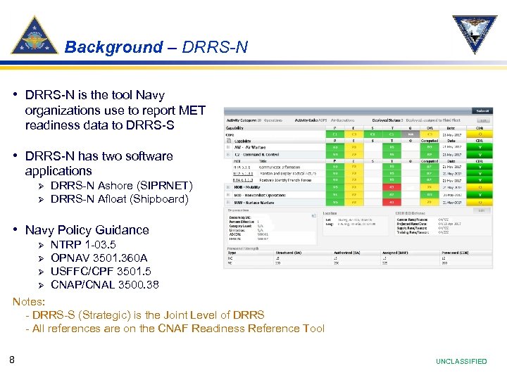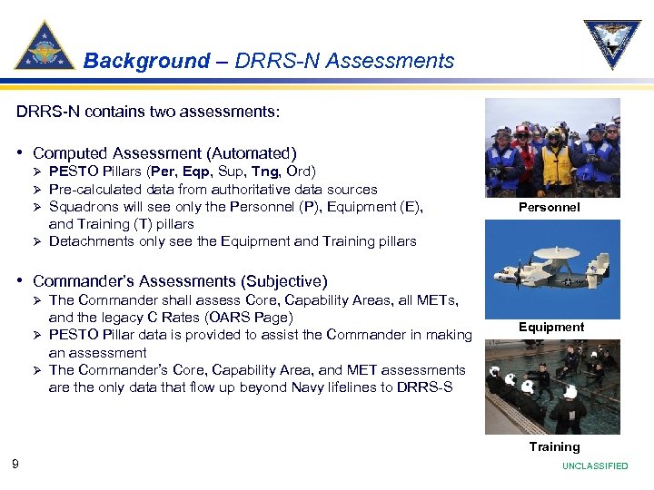 Background – DRRS-N • DRRS-N is the tool Navy organizations use to report MET readiness data to DRRS-S • DRRS-N has two software applications Ø Ø DRRS-N Ashore (SIPRNET) DRRS-N Afloat (Shipboard) • Navy Policy Guidance Ø Ø NTRP 1 -03. 5 OPNAV 3501. 360 A USFFC/CPF 3501. 5 CNAP/CNAL 3500. 38 Notes: - DRRS-S (Strategic) is the Joint Level of DRRS - All references are on the CNAF Readiness Reference Tool 8 UNCLASSIFIED