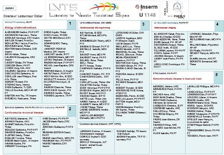 03/2015 Directeur: Letourneur Didier NICOLETTI Antonino, PU P 7 1 Biology of atherothrombosis 3 GROS Angèle, Thèse GUEDJ Kevin, IR CDD HO-TIN-NOE Benoit, CR 1 Inserm HOANG QUOC Thang, Thèse JANDROT-PERRUS Martine, DR 1 Inserm LASCHET Jamila, IR P 7 LE BORGNE Marie, MCU P 7 LOYAU Stéphane, IE Inserm MAZIGHI Michael, PU-PH P 7 MICHEL Jean-Baptiste, DRE Inserm MORVAN Marion, AI Inserm NATAF Patrick, PU-PH P 7 NGUYEN Kim Ahn, IE CDD NICOLETTI Antonino, PU P 7 OLLIVIER Véronique, IE Inserm RASSER Charlotte, Thèse ROUCHAUD Aymeric, PH SANNIER Aurelie, Thèse VENISSE Laurence, TR P 7 BOILEAU Catherine, PU-PH P 7 JONDEAU Guillaume, PU-PH P 7 2 Cardiovascular structural diseases IUNG Bernard, PU-PH P 7 JACOB Marie-Paule, DR 2 CNRS JONDEAU Guillaume, PU-PH P 7 MESSIKA-ZEITOUN David, PH P 7 RABES Jean-Pierre, MCU-PH VAHANIAN Alec, PU-PH P 7 VARRET Mathilde, CR 1 Inserm AID Rachida, IE CDD ATLAN Michael, MCU-PH, Thèse AVRAMOGLOU Thierry, MCU P 13 BARBAUD Christel, PU P 13 BATAILLE Isabelle, MCU P 13 BAUDOT Anne, MCU P 5 BAUMERT Hervé, PH P 5 BELIBEL Rima, Thèse BO Li, Thèse BUTT Amena, Thèse CHARNAUX Nathalie, PU-PH P 13 CHAUBET Frédéric, PU P 13 CHAUVIERRE Cédric, CR 1 Inserm CHOLLET Lucas, Thèse cifre DELATTRE Cécilia, Thèse EDER Véronique PU-PH P 13 GUEGUEN Virginie, MCU P 13 GUYOT Erwan AHU P 13 HADDAD Oualid, IE P 13 HATTE Louis, Thèse cifre HAMIDI Fatima, Al ½ CDD HLAWATY Hania, MCU P 13 JUENET Maya, Thèse LABBE–BARRERE Amélie, MCU P 13 LAGUILLER-MORIZOT Christelle, MCU-PH P 13 LETOURNEUR Didier, DR 1 CNRS LEVOYE Angélique, MCU P 13/Inserm chaire LOUIS Gerard, PU P 5 MAILLARD Loic, Thèse MAIRE Murielle, AI P 13 MARINVAL Nicolas, Thèse MICHEL Eléonore, Thèse MORA-PONSONNET Laurence, PU P 13 NGUYEN Dinh Hoang, Thèse OUDARD Olivier, PU P 13 PAVON-DJAVID Graciela, IR P 13 PEREIRA Jessica, IE CDD P 13 PELLE Anne, PU P 13 RICHARD Benjamin, MCU P 13 ROBERT Romain, IE CDD RODRIGUEZ RUIZ Violeta, ATER P 13 SABOURAL Pierre, IE CDD SPELLE Laurent, PU-PH P 7 SUTTON Angela, MCUPHP 13 VARNA Mariana, Post-Doc VO Sophie, Thèse ZULUAGA TAMAYO Marisol, Thèse Common service (Inserm, UP 7, UP 13) LEGRAND Corinne, AI Inserm : Administration manager COMUCE Sophia. Tc CDD secretary BOUCLY Christophe, AJT Inserm : animal house department LE GULUDEC Dominique, PU-PH P 7 4 Cadiovascular imaging Cardiovascular Bio-engineering AJZENBERG Nadine, PU-PH P 7 ANDREATA Francesco, Thèse AROCAS Véronique, CR 1 Inserm BAYLES Richard, Post-Doc BOULAFTALI Yacine, Post-Doc BOUKAIS Kamel, Thèse BOUTON Marie-Christine, DR 2 Inserm BRUN Adrian, Thèse CALIGIURI Giuseppina, DR 2 Inserm CAROFF Gildaz, PH Thèse CORCOS Olivier, PH P 7 CUNGH Hong Anh, AHU DELBOSC Sandrine, AI Inserm DESCHILDRE Catherine, AI DESILLES Jean-Philippe, Post d’Ac Thèse DORENT Richard, PH ETIENNE Harry, Interne EVEN Guillaume, Tc CDD FAILLE Dorothée, MCU AP-HP P 7 GASTON Anh-Thu, TR Inserm GHEBOULI Radouane, Thèse ABI FADEL Marianne, PU ARNAUD Pauline, AHU AUBART Mélodie, Post d’Ac Thèse BOILEAU Catherine, PU-PH P 7 BARBIER Mathieu, Post-Doc ELBITAR Sandy, Thèse GHALEB Youmna, Thèse GROSS Marie-Sylvie, AI Inserm HANNA Nadine, PH HIMBERT Dominique, PH LETOURNEUR Didier, DR 1 CNRS IDHIHAR Hadidja, TR Inserm : Cell Culture ADONAI Pascaline, TR P 13 : secretary P 13 AL SHOUKR Faisal, Post-doc BEN ALI Khadija, IE CDD BEN AZZOUNA Rana, Thèse BURG Samuel, PH AP-HP DIEUDONNE Arnaud, Thèse EL BEZ Yedhi, IR CDD FELDMAN Laurent, PU-PH P 7 HYAFIL Fabien, PH P 7 JOURNE Clément, AI Inserm LAISSY Jean-Pierre, PU-PH P 7 LEGULUDEC Dominique, PUPH P 7 LEYGNAC Sébastien, Phys Med AP-HP MEULEMANS Alain, MCU-PH P 7 MILLINER Milan, Phys Med AP-HP OU Phalla, PU-PH P 7 ROUZET François, MCU-PH P 7 SLAMA Jérome, AHU P 7 SORBETS Emmanuel, MD Thèse STEG Gabriel, PU-PH P 7 5 Atherothrombotic disease in heart and brain ABERGEL Hélène, ARC AMARENCO Pierre, PU-PH P 7 BACHER Anne, ARC BENYAHIA Chabha, Thèse BOUFFARD Catherine, Infirmière de recherche CHOQUEUX Christine, IE P 7 CODOGNO Isabelle, ARC DIALLO Devy, Thèse DUCROCQ Gregory, PH Thèse FABRE Jean-Etienne, DR Inserm FARNOUD Résa, ARC JULIARD Jean-Michel, PH P 7 KLEIN Isabelle, PH P 7 LAVALLEE Phillippa, MCU-PH P 7 LESECHE Guy, PU-PH P 7 LONGROIS Dan, PU-PH P 7 LOUEDEC Liliane, AI Inserm MARRE Amélie, ARC MAWHIN Marie-Anne, Thèse NOREL Xavier, IE CNRS OUDGHIRI Meryem, ARC RANGE Helène, Thèse SIMON Tobassome, PU-PH P 6 SONNEVILLE Romain, PH P 7 SPIELER Jean-François, économiste de santé STEG Philippe Gabriel, PU-PH P 7 TOBASSOMME Simon, PU-PH P 7 TOUBOUL Pierre-Jean, PATT