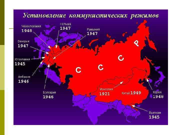 2. Распространение сталинской модели В 1945 г. коммунистические режимы были установлены в Югославии и Северном Вьетнаме В 1946 г. - в Албании, Болгарии В 1947 г. - в Польше , Венгрии, Румынии В 1947 г. - в Чехословакии, Северной Корее В 1949 г. коммунисты одержали победу в гражданской войне в Китае Сталин диктовал лидерам этих стран линию поведения на международной арене и во внутренней политике Сталин оказывал огромную материальную помощь со стороны СССР