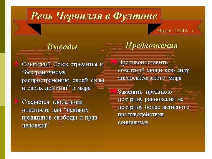 1. У истоков «холодной войны» США и Великобритания усиливали политику сдерживания «советской экспансии» С 1945 г. разрабатывались планы нанесения ядерных ударов по крупнейшим городам СССР В марте 1946 г. бывший премьер-министр Англии У. Черчилль произнес в Фултоне речь о «железном занавесе» Один из планов, одобренных военным и политическим руководством США, предусматривал использование 196 атомных бомб для уничтожения 20 крупнейших советских городов Советская карикатура на У. Черчилля