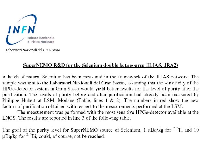 ILIAS work summary In 2003, what we thought : 1 - Selenium was not possible to buy, but as in NEMO 3 we have to rent it (possible for years…) 2 - Kurchatov (via ITEP) was the only producer in our case So, we did a Convention with ITEP for a rent of 2 kilos In 2006 what we know : 1 - after a meeting in Munich with the Gerda team : it is possible to buy Selenium as they do for Germanium 2 - There is 3 possible plants in Russia, Krasnoyarsk (able to produce hundreds of kg), Tomsk (almost able of hundred), Kurchatov (for kilograms). 3 - there is a French importer (Chemgas) in touch with these 3 centers, ready to organize meetings with the real producers.
