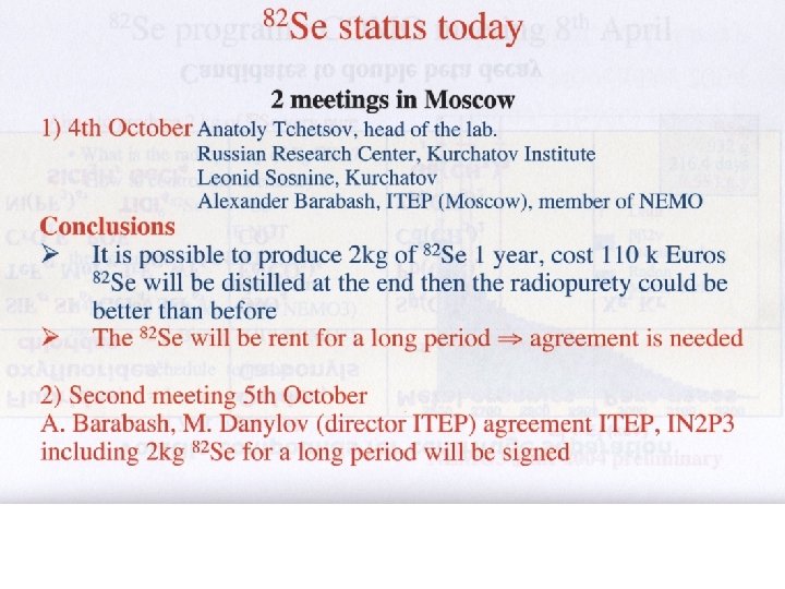 All possible sites in Russia are (and Chemgas is in touch with all of them) : For Se 82, the choice of Chemgas is Tomsk Actually Alexander Barabash thinks that the 2 kilos tagged « ITEP-Kurchatov » were produced in Tomsk (September 2006 announcement !). At my last questioning in June 2006 at Santa Fe, Alexander confirmed me that the 2 physicists of Kurchatov were doing the job (but I have still no report on this from Kurchatov).