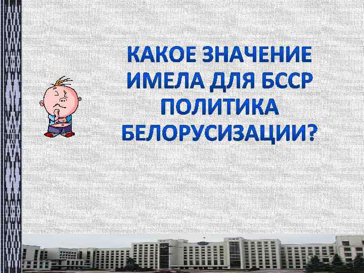 Направления белорусизации Расширение сферы употребления и применения белорусского языка, перевод на белорусский язык (в образовании, в государственных органах, армии). Ликвидация неграмотности и развитие системы образования. Организация научно-исследовательской деятельности по всестороннему изучению Беларуси. Выдвижение белорусов на ответственную работу в органы партийной и советской власти – КОРЕНИЗАЦИЯ. Развитие белорусской культуры Создание национальной системы образования.