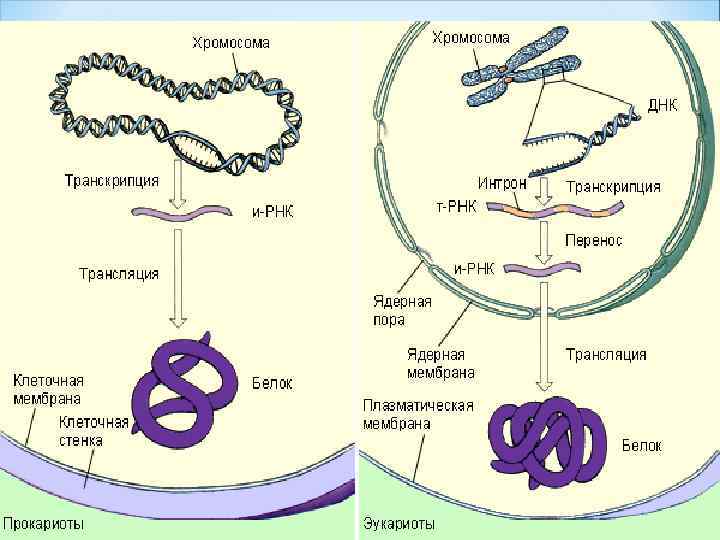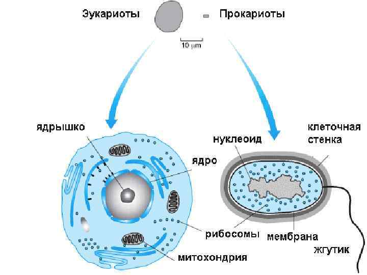 Эволюционное значение клеточного ядра Строение типичной клетки прокариот. Основное функциональное отличие клеток эукариот от клеток прокариот заключается в пространственном разграничении процессов транскрипции (синтеза матричной РНК) и трансляции (синтеза белка рибосомой), что дает в распоряжение эукариотической клетки новые инструменты регуляции биосинтеза и контроля качества м. РНК.