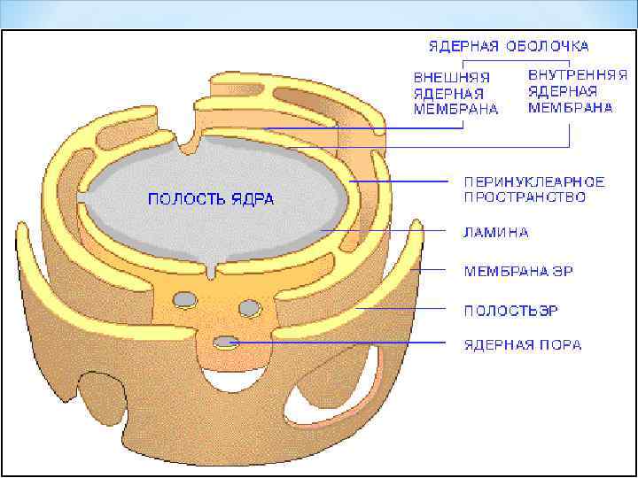 * Ядерная оболочка состоит из двух мембран — внешней (1) и внутренней (3), между которыми располагается перинуклеарное пространство (2). Функции: • барьерная; • транспортная (ток через поры); • участие в создании внутриядерного порядка (фиксация хромосомного материала в трехмерном пространстве ядра).