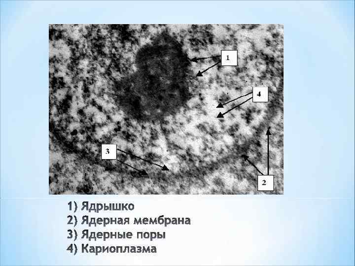 * 1. Двумембранная ядерная оболочка. 2. Пора 3. Эухроматин 4. Гетерохроматин 5. Ядрышко 6. Гранулы 7. Фибриллы 8. Кариоплазма