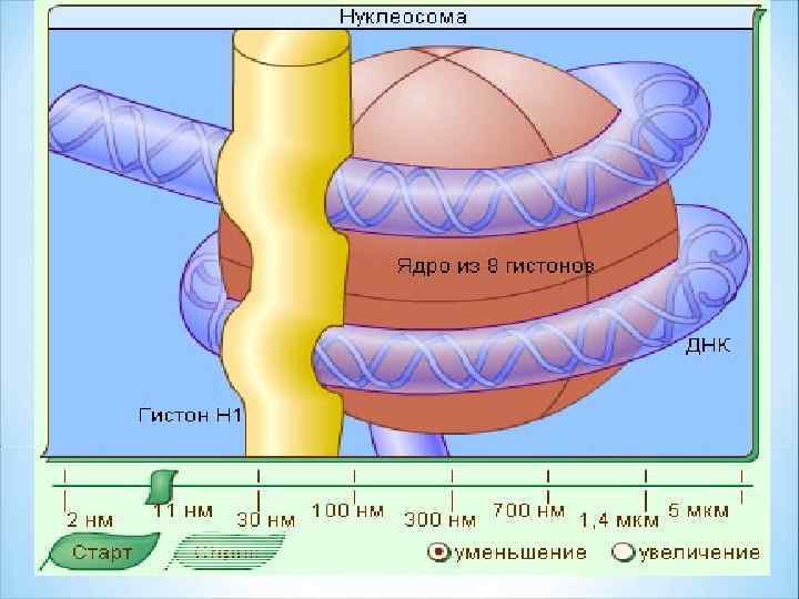 *Гистоны (80%) -Небольшие по массе белки /всего 5 видов -Н 1, Н 2 А, Н 2 В, Н 3, Н 4 -Обладают основными свойствами -Не обладают видовой специфичностью -Могут самоагрегироваться с молекулой ДНК с образованием глобулярной частицынуклеосомы * Белки хроматина Негистонные белки (20%) -Более 500 видов -Обладают видовой специфичностью -Большая часть относится к белкам ядерного матрикса -Большое количество белков-ферментов (днк и рнк полимеразы, и др. )