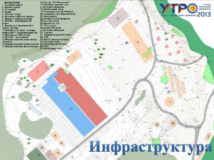 Комфортные палатки Современные быстровозводимы е образовательные шатры Интернетаудитория Радио, телевидение Безопасность: медицина, МЧС, охрана, страхование, представители санэпидстанции Спортивные площадки и оборудование Малая и большая сцены Кафе, зона отдыха
