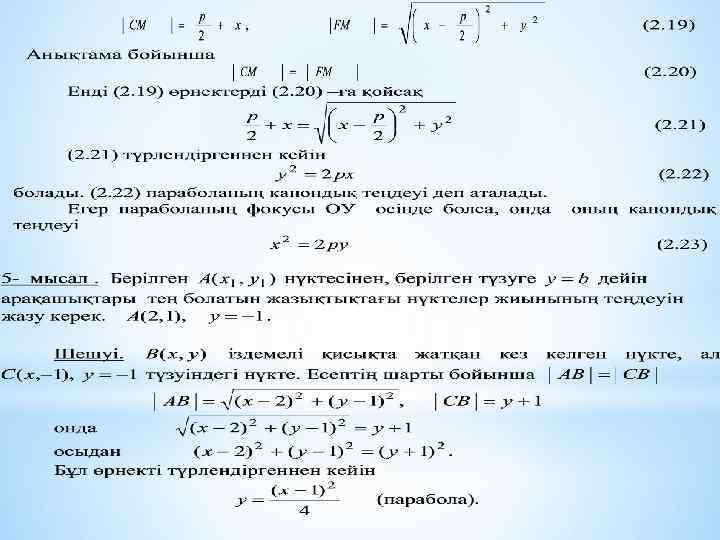 (2. 18) гиперболаның канондық теңдеуі, - гиперболаның нақты, ал жорамал жарты осьтері 4. Парабола. Фокус деп аталатын нүктесіне және директриса деп аталатын бір түзуден арақашықтары тең болатын, жазықтағы нүктелердің геометриялық орны парабола деп аталады.