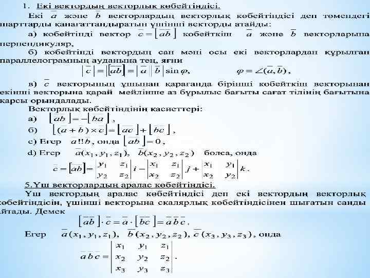 2. Матрицаларды көбейту. Егер бірінші матрицаның баған саны мен екінші матрицаның жол саны өзара тең болса, онда олар үйлесімді матрицалар деп аталады. Яғни бірінші матрицаның - ші жолындағы әрбір элементті екінші матрицаның jшы бағанындағы сәйкес элементтерімен жеке-жеке көбейтінділерінің қосындысын көбейтінді матрицаның - ші жолы мен j- шы баған қилысындағы сәйкес элементті етіп жазылған m*k өлшемді жаңа С матрицасын анықтаймыз. 3. Анықтауыштар жөніндегі ұғым, тек шаршы (квадрат) матрицалар үшін ғана енгізіледі. Матрица берілсін, онда (1. 5) ережесі бойынша есептелген санды А матрицаның екінші ретті анықтауышы деп анықтайды.